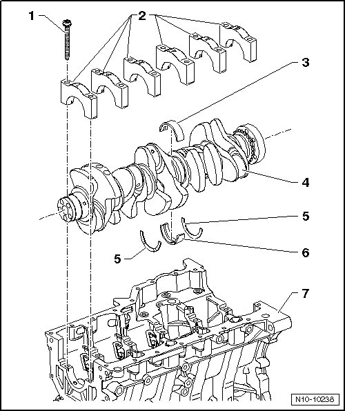 • The allocation of the bearing shell for the bearing cap is identified by a series of letters on the crankshaft/vibration damper pulley flange. The first letter of the row of letters represents bearing " 1", the second letter is for bearing "2", etc.