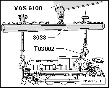 - Install the (3033) as shown and lift using the (VAS 6100) from (V.A.G 1383A).