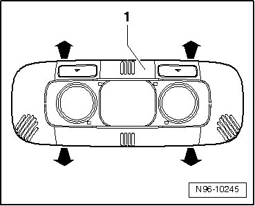 - Press both retaining tabs - 2 - in - direction of arrow A - and remove complete interior and reading light - 1 - in - direction of arrow B - out of molded headliner.