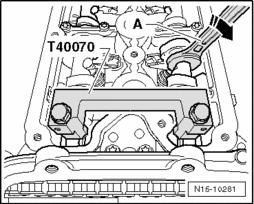 - Install camshaft locator T40070 as depicted on to camshafts and tighten bolts to 20 Nm.