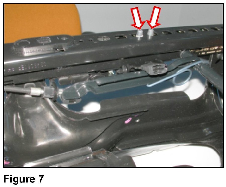 - Press down on the lengthwise adjustment lever (figure 6, No. 1) in direction of the arrow. The pins (illustration 7, blue arrows) must fully seat into the left and right seat rails.