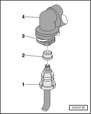 - Press the hose/line assembly - 1 - and seal - 2 - into the clutch master cylinder connection - 4 - until the clip - 3 - clicks into place.