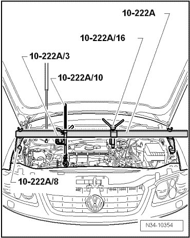 - If the engine lifting eyes for the engine support bridge (10 - 222 A) are covered by the engine cover, removed it.
