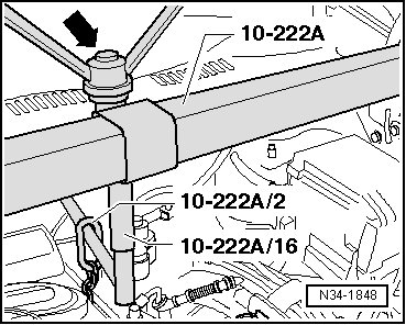 - Bring the engine/transmission assembly into a angled position by lowering it using the engine support bridge (10 - 222 A) spindles.