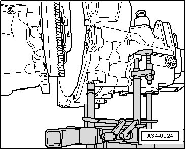 - Carefully lower the transmission while guiding the right flange shaft - A - into the flywheel/intermediate plate area as shown.