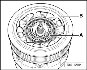 - Position the drive plate- C - between the rubber elements until they touch the A/C compressor shaft- B -.