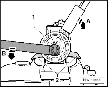 - Secure the drive plate- 1 - with a commercially available strap wrench in the - direction of the arrow A - and tighten the driveshaft with a torque wrench in the - direction of the arrow B - (35 +/- 5 Nm).