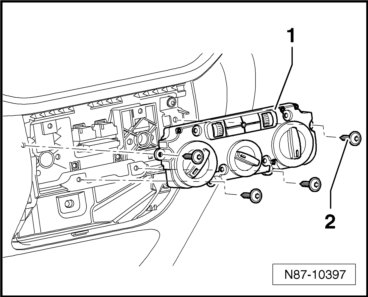 - Remove the bolts - 2 - (4.2 x 45) and - 3 - (4.2 x 16) and the controls - 1 - from the center console.