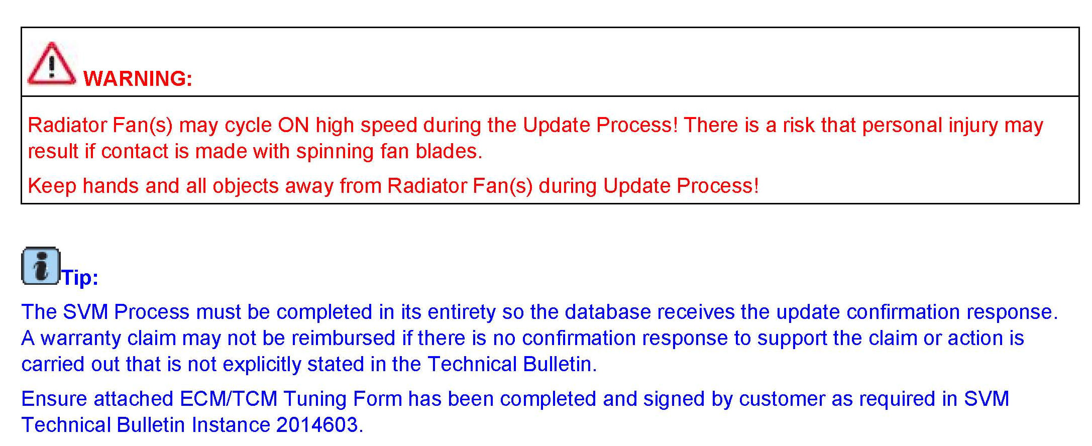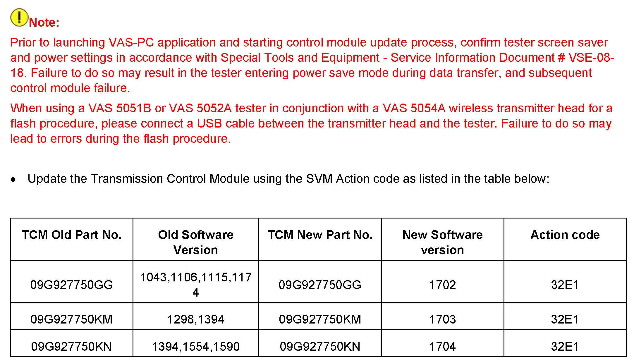 Update the Transmission Control Module using the SVM Action code as listed in the table: