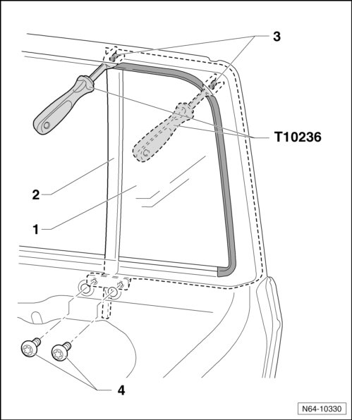 - Remove the door window glass - 1 - together with the brace - 2 -.