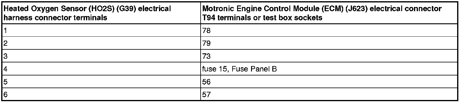 - Using a multimeter, check the Heated Oxygen Sensor (HO2S) (G39) electrical harness connector terminals to the Motronic Engine Control Module (ECM) (J623) electrical harness connector T94 terminals for an open circuit.