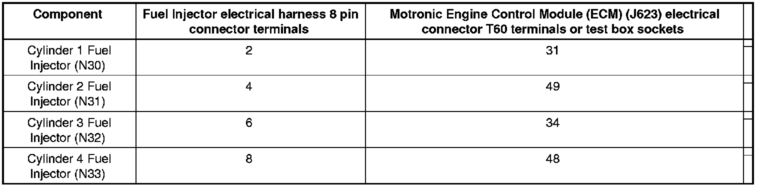 - Using a multimeter, check the Fuel Injector electrical harness connector terminals to the Motronic Engine Control Module (ECM) (J623) electrical harness connector T60 terminals for an open circuit.