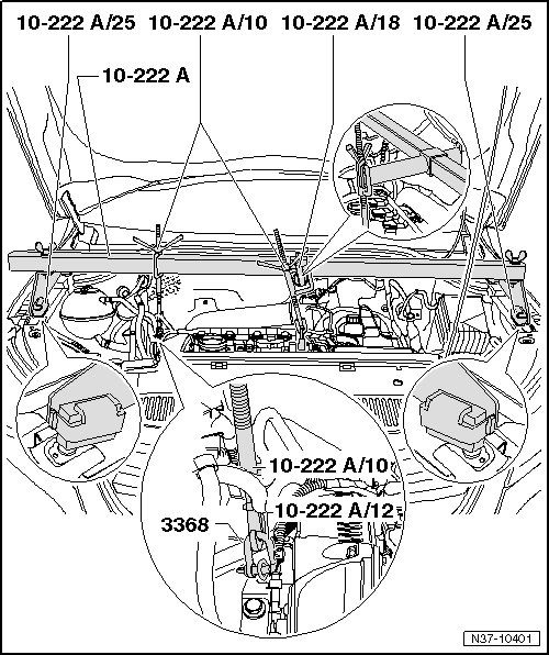 - Align the adapter (10-222 A/18) on the engine support bridge (10-222 A) so the spindle hook engages vertically in the lifting eye on the engine.