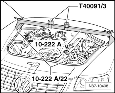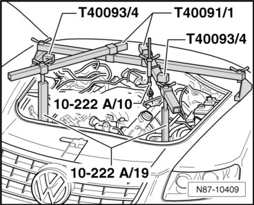 - Assemble the other components of the Engine Support Bridge (10-222 A) as shown in the illustration. To do so, position the Supports (10-222 A/19) on the longitudinal member seams be careful of the refrigerant lines on the longitudinal member when doing this.
