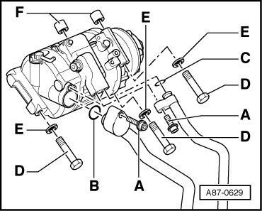 - Install the A/C compressor with the bolts - D - and washers - E - on the bracket (bolt - D - tightening specification: 25 Nm). Be careful of the bushings - F -.