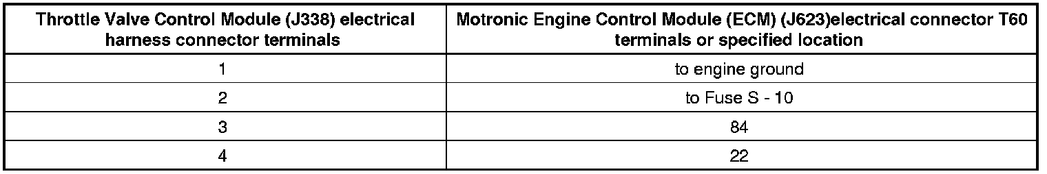 - Using a multimeter, measure the voltage between terminal 1 and 4 of the Throttle Valve Control Module (J338) electrical harness connector.