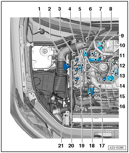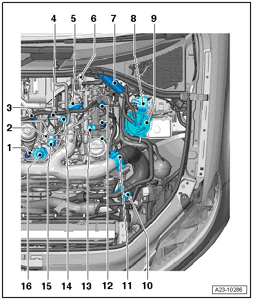 • Exhaust Gas Recirculation (EGR) Cooler Switch-Over Valve 2 -N381- not shown in the overview is located on the left