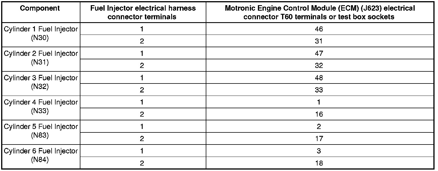- Using a multimeter, check the Fuel Injector electrical harness connector terminals to the Motronic Engine Control Module (ECM) (J623) electrical harness connector T60 terminals for a short to ground or voltage, high resistance or an open circuit.