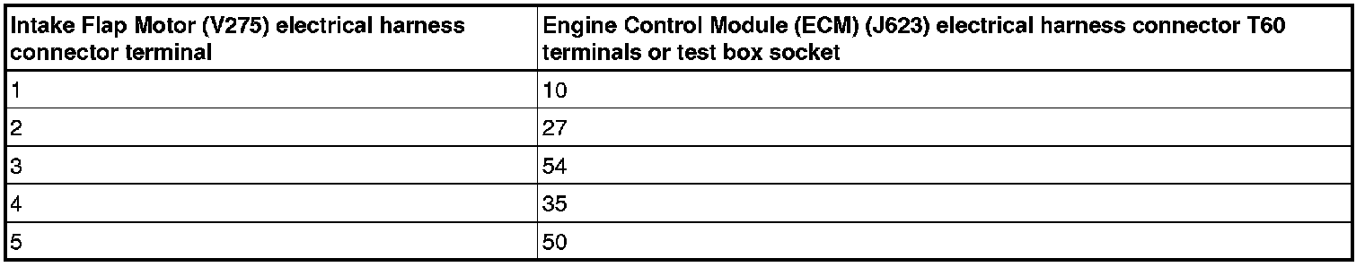 - Using a multimeter, check the Intake Flap Motor (V157/V275) electrical harness connector to the Engine Control Module (ECM) (J623) electrical harness T60 connector for resistance.