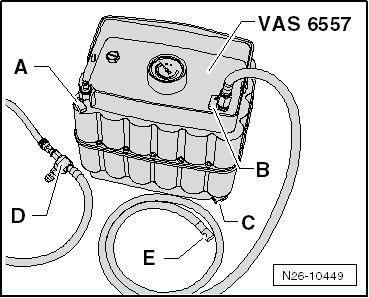 - To empty the (VAS 6557), hold the connection on the shut off valve - C - over a suitable container and open the shut off valves - A and C -.