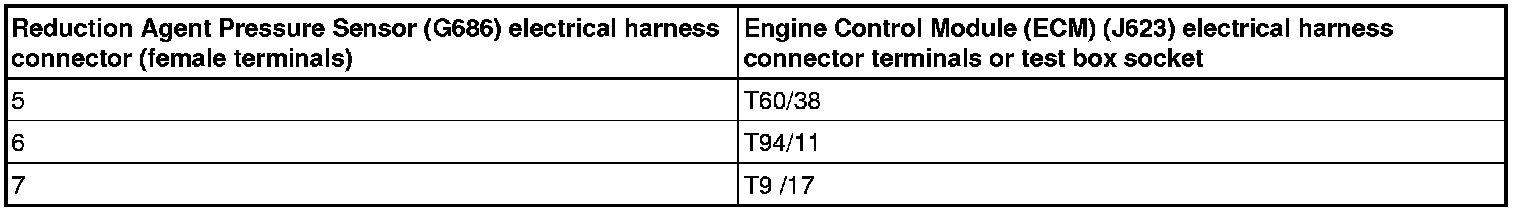 - Using a multimeter, check the Reduction Agent Pressure Sensor (G686) electrical harness connector to the Engine Control Module (ECM) (J623) electrical harness T94 connector for resistance.