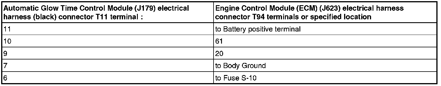 - Using a multimeter with BLACK lead connected to engine ground, measure the voltage of terminal 11 (relay terminal 30) and then 6 (relay terminal 87) of the Automatic Glow Time Control Module (J179) black (relay) harness connector.