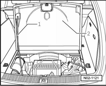 - Open luggage compartment floor cover - 2 - and secure with stay rod - 1 -.