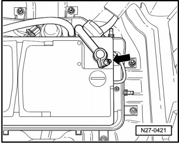 To increase safety in the event of a crash, the battery under front left seat is equipped with a battery isolator. In an accident, the airbag control module triggers a charge disconnecting the voltage supply wire to the starter. Battery isolation is performed pyrotechnically, with a very small explosive charge. To avoid accidentally triggering the charge when working on the battery or the battery isolator, you must absolutely first disconnect the battery ground (GND) on the negative (-) terminal of the battery.