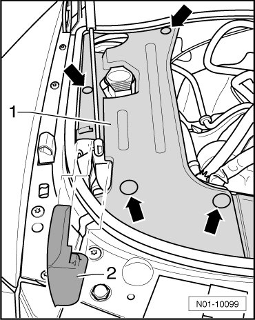 - Set engine cover - 1 - onto fastening points - arrows - and press it on, until it engages.