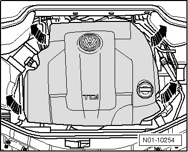 - First pull off engine cover at front (as seen in driving direction) using both hands - arrows -, and then lift at the rear (in area of bulkhead) using both hands.