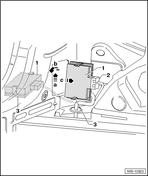 - Reach under the tail lamps in the D-pillar. Remove the control module - 1 - and its mount - 3 - - arrow a -.