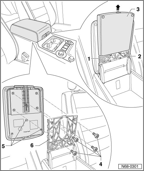 - Separate center armrest from hinge plate - 6 - near fastening locations - 5 -.