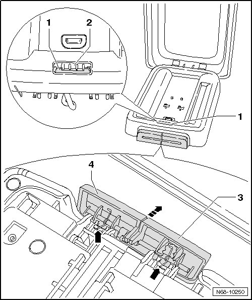 - Unclip storage compartment - 1 - upward from center armrest mount - 2 -.