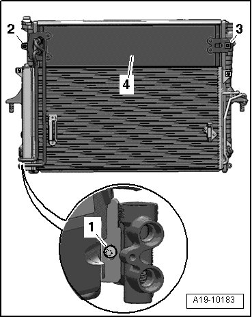 - Remove bolts - 1 - on rear side of radiator.
