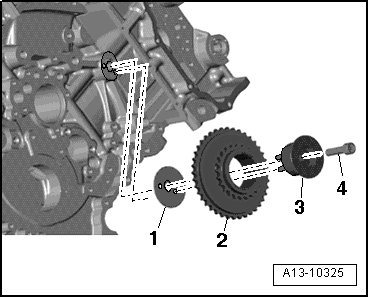 Alignment bushings in right camshaft timing chain drive sprocket mounting pins - 3 - must engage in holes in thrust washer - 1 - and cylinder block.