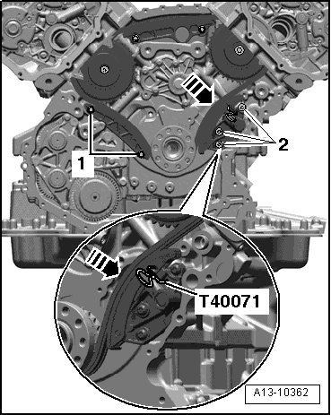 - Press drive chain tensioner guide rail in - direction of arrow - and remove locking pin (T40071) from chain tensioner.