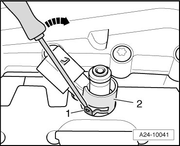- Using a screwdriver, bend the retaining tabs - 1 - of the radial adjustment aside - arrow - and pull the support ring - 2 - from the fuel injector.