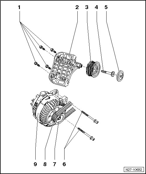 • Generator ribbed belt pulley, removing and installing, refer to => [ Ribbed Belt Pulley on Generator, Air Cooled ] Ribbed Belt Pulley on Generator, Air Cooled.
