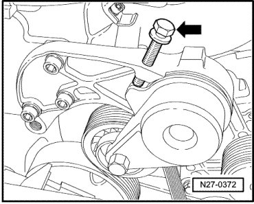 - Remove bolts for tensioner - arrows -.