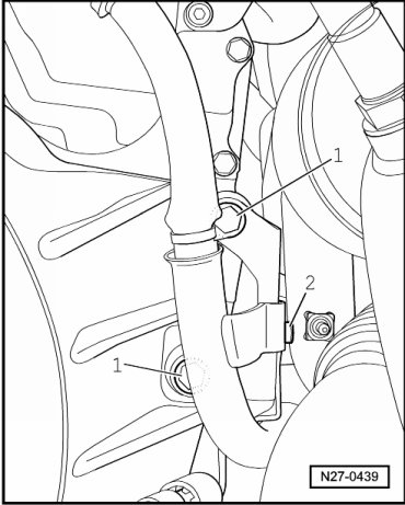 - Remove bolt - 1 - from exhaust system bracket - 2 - from engine side and remove bracket.