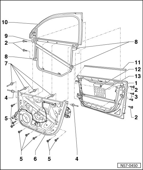 Entire door consists of outer door panel - 1 -, assembly carrier - 6 - and window frame - 10 -. When assembly carrier and window frame are joined together, it is referred to as a subframe.