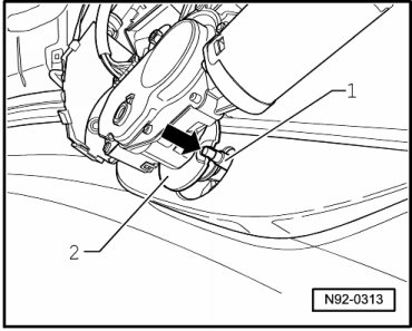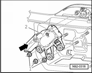 • If the position of drive pin - 1 - on eccentric lever does not line up to control disc on rear window wiper motor - 2 - - arrow -, turn wiper arm shaft from outside. Do not twist control disc of rear window wiper motor - 2 - under any circumstances.