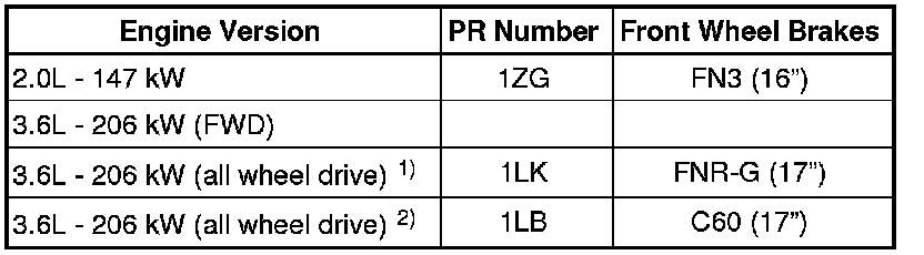 • The following tables explain the PR numbers. These are important for the combination brake caliper/brake disc and brake pad.