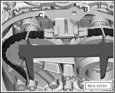 - Once the specified value is reached, measure the distance between the mark on the intake camshaft - B - and the mark on the exhaust camshaft - C -.