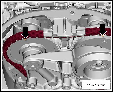 - Rotate the crankshaft from above, using the vibration damper bolt and the socket SW 24, in engine rotation direction until the marks - arrows - are almost on top.