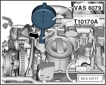 - Insert the dial gauge 0-10 mm (VAS 6079) with the extending piece (T10170A/1) all the way and secure it with the locking nut - arrow -.