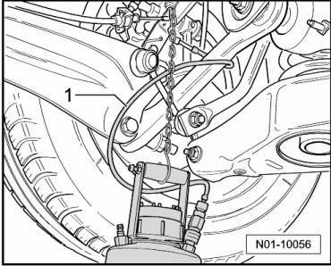 - Connect collector bottle bleeder hose - 1 - to left front bleeder screw, open bleed screw and allow the corresponding quantity to flow out (see table). Close the bleeder screw, torque, refer to=> Suspension, Wheels, Steering 44 Removal and Installation.
