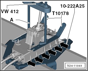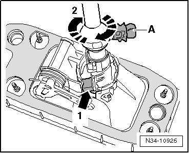- Turn the shift lever guide in the - direction of arrow 2 - until the ball head pin - A - is above the opening in the shift housing.