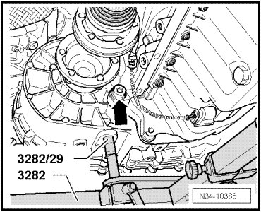 - Place the transmission on the engine-/gearbox jack (V.A.G 1383 A).