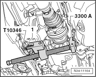 - Install the bracket (T10346) with the bolt - 1 - in the left threaded hole in the subframe.